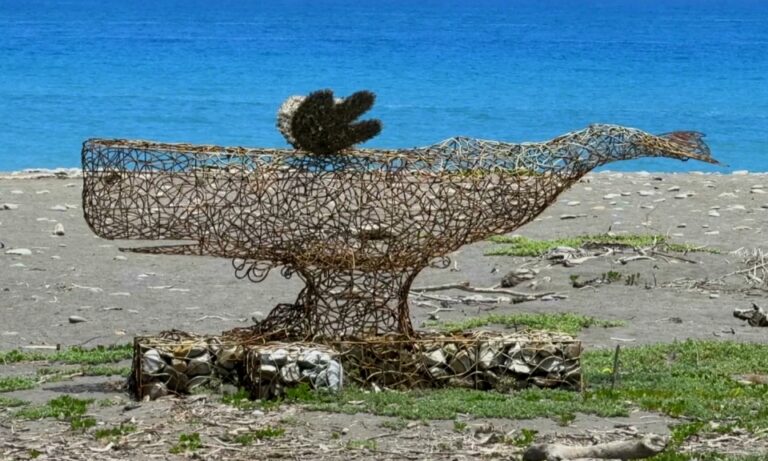 畫板上黏上不同顏色的紙,每個顏色都代表著台東各地不同的色彩,像是金針、釋迦等,南迴藝術季今年邁入第5年,有兩件全新作品位在大鳥休憩站,是藝術家安德魯.阿南達.沃格爾與大鳥部落一起完成;另一件「成為山的形狀」則在金峰鄉正興衛生站前,是藝術家安君實與正興部落的共創。