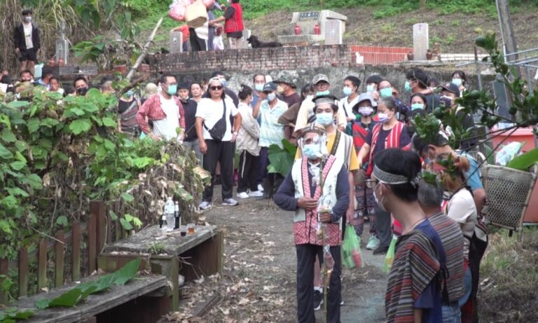 在頭目帶領下,苗栗泰安鄉蘇魯部落族人,從老到少一群人徒步往部落墓園出發,7月15號是蘇魯部落一年一度的祖靈祭,大家備妥供品要去祭拜祖先,到了墓園後,頭目就會率先進行公祭祈福儀式,隨後各家戶再行前往自己的祖墳,進行祭祀與追思。