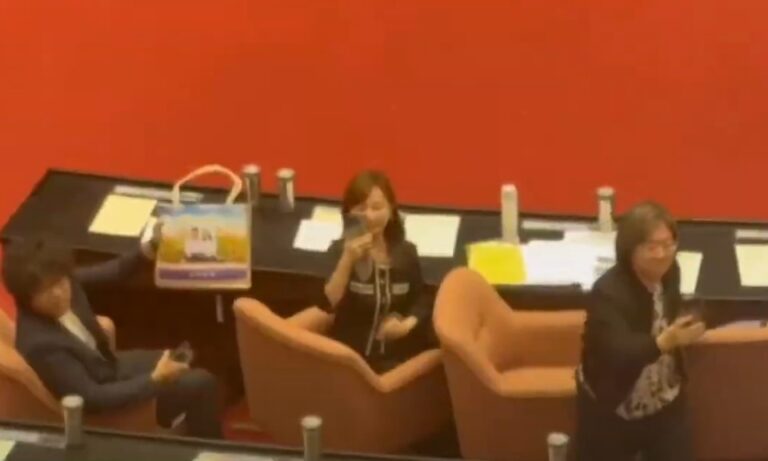 立委沈柏洋拿了印有傅崐萁夫婦的提袋,朝剛質詢完的傅崐萁大罵並走向前。
