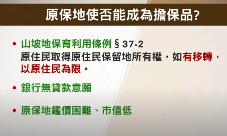 生活 原保地 貸款 原保地有望成擔保品 內政部:將建估價體系 490 原住民族人所擁有的原保地,究竟能不能成為到銀行貸款的擔保品?目前受到山坡地保育利用條例,原保地移轉以原民為限,再加上原保地鑑價困難,市價也偏低,導致有需求的民眾,不得不轉往融資借貸,不過這些問題有望找到解方,2日立法院財政委員會上,內政部正向回應,將建立原保地的估價體系。 2024-05-03 19:04