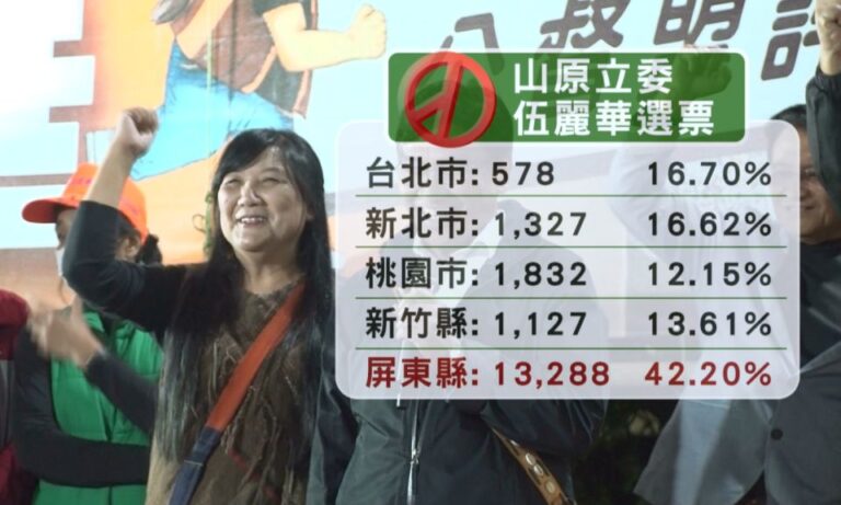 民進黨首位山地原住民立委伍麗華,在2024總統立委選戰成功連任、甚至拿下3萬1千多票,比起上屆多出6千票左右,尤其關鍵的屏東縣開出13288票、得票率高達42.2%;學者指出伍麗華除了固守屏東票倉,在外縣市也取得不錯成果,像是北部地區也拿下約5000票,顯示四年來勤走服務,族人相對有感。
