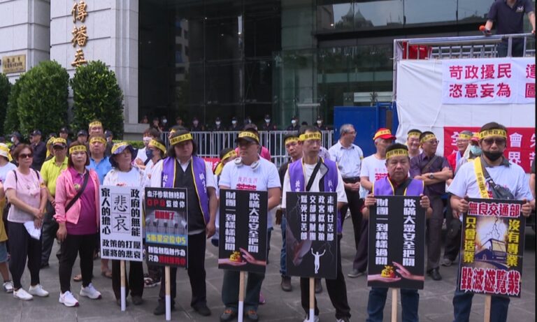 政經 交通部 遊覽車 駕駛員刷卡機 新規強制遊覽車裝刷卡機 駕駛不滿集結抗議 253 頭上綁著黃色緞帶、手中拿著大型看版、喊著口號,近百名遊覽車駕駛員聚集到交通部周圍,他們遊行抗議要爭取遊覽車權益。 2024-08-26 19:08