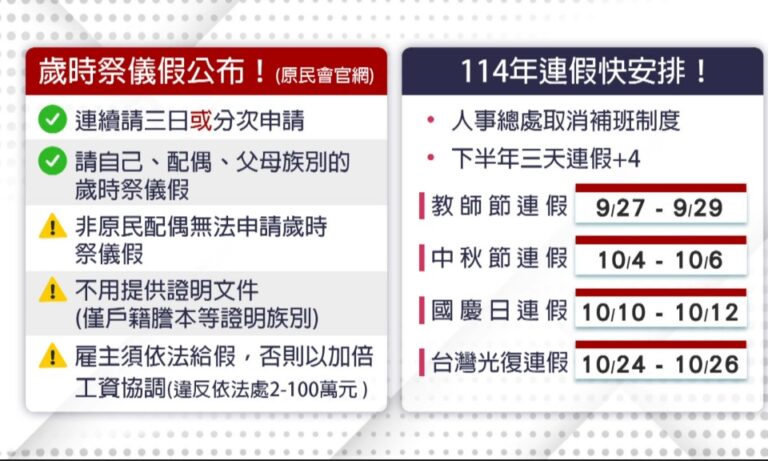 歲時祭儀假公布,114年連假快安排!(原民會官網) 未來要掌握放在三要點,三天歲時祭儀假可以連續請、也能分次請假,並且個人可以選擇自己、父母或是配偶的族群歲時祭儀天數來向雇主請;不過非原民的配偶是無法請歲時祭儀假的,而要怎麼請呢?...。