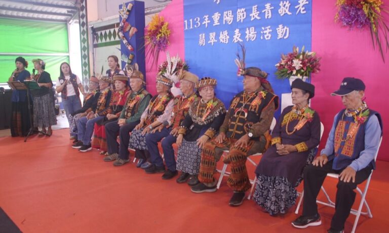 來義鄉各村的敬老楷模從會場後方進場,一個一個接受大家的掌聲,來義鄉重陽敬老活動接連受到兩個颱風影響,6日終於在古樓聚會所隆重舉行,包括敬老楷模7位、長青楷模7位、翡翠婚夫妻及礸石婚夫妻10對一起接受表揚。