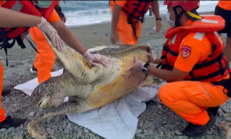 生活 台東蘭嶼 漁船 綠蠵龜 螺旋槳 野生動物保育 蘭嶼雌綠蠵龜岸邊亡 外傷疑漁船螺旋槳所致 99 17號中午,民眾在台東蘭嶼八代灣沙灘發現一隻綠蠵龜,而海巡跟動保志工到場後合力把綠蠵龜翻身,發現綠蠵龜身上有明顯傷痕,懷疑是遭漁船螺旋槳打傷。 2022-06-18 19:09