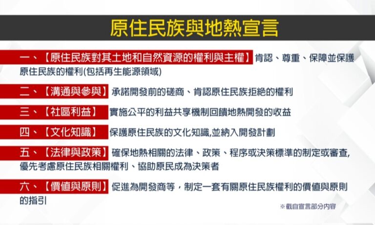 環境 原住民族與地熱宣言 台灣原住民族地熱論壇 地熱 金崙村 原住民族與地熱宣言 提出6大具體訴求 266 由環境權保障基金會及台灣原住民族政策協會,共同主辦的「台灣原住民族地熱論壇」9日登場,也在論壇中發布《原住民族與地熱宣言》。 2025-01-09 19:20