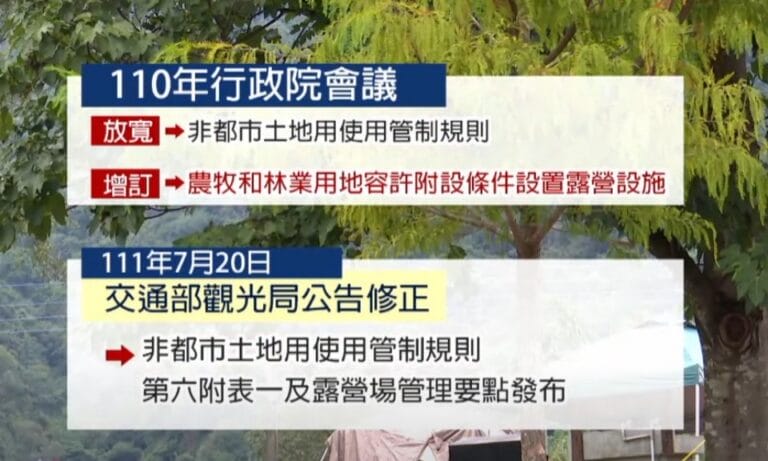 政經 生活 觀光局 露營 露營區合法化 露營場 露營用地 新增露營相關設施法令 估下半年起分區座談 203 露營區合法化議題,不管是在立法院各委員的推動下,或是舉辦多場公聽會的敦促下,去年行政院放寬非都市土地用使用管制規則,增訂農牧跟林業用地容許附設條件,設置露營設施後,交通部觀光局在今年7月中旬,推出修正...。 2022-09-14 12:10