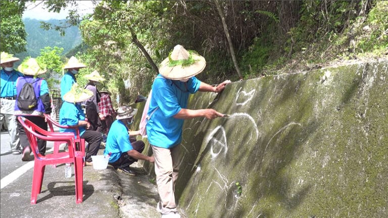 原鄉 教文 南溪 文化藝術創作 清淨環境 老幼共學 道路擋土牆 青苔雕刻繪畫 用創意美化道路環境 南溪居民一同創作「青苔雕刻畫」 33 描繪、刻畫,南溪部落文健站的長輩及族人,利用鐵筆、鋼刷等用具,將卡通人物、農耕生活等圖畫,刻繪在布滿青苔的道路擋土牆上。 2022-04-05 12:33