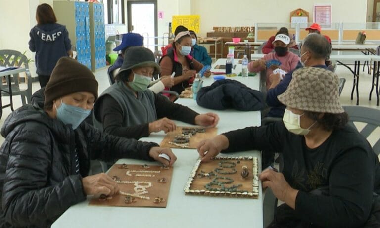 將石頭及貝殼塗上熱溶膠後黏貼在木板上,比西里岸部落文化健康站貝殼與石頭的對話課程,讓長者們特別發揮創意,用熟悉年輕時經常到潮間採集經挑肉後丟棄的各類貝殼,以及石頭製作成刻有自己名字的精美手作畫。