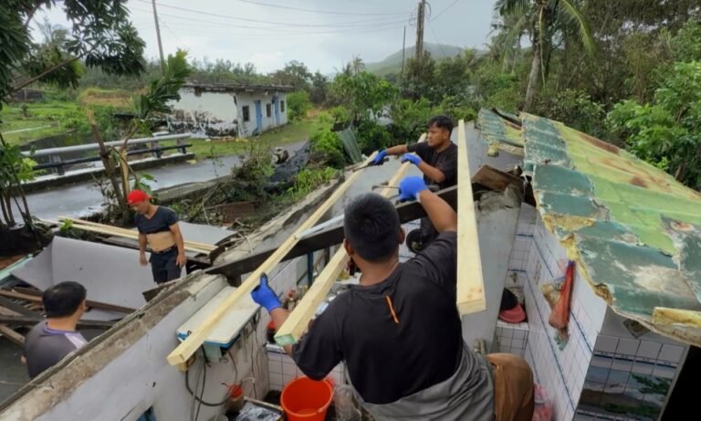 工人在屋頂上敲敲打打,釘上橫梁,再蓋上木板,加緊協助災戶修復家園,9月23號凌晨樺加沙颱風侵襲期間,在達仁鄉安朔村靠海地區,疑似出現龍捲風,強風吹掀多戶民宅鐵皮屋頂,造成嚴重漏水問題,志工緊急協助搭建臨時屋頂,讓居民至少能有個安身之處。