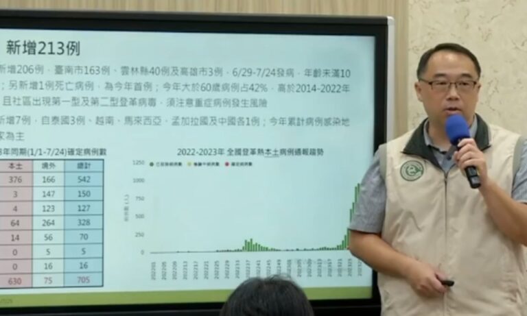 登革熱疫情持續延燒,疾管署公布今年(2023)首例本土登革熱死亡個案,是一名台南市40多歲女性,7月16日出現發燒症狀,因症狀未改善於18日就醫住院治療,經醫院通報檢驗後確診,同時診斷有熱衰竭情形,於7月21日因病況惡化不幸過世。