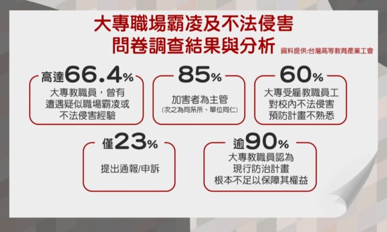 教文 社會 大專教職員 職場受不法侵害 高教工會 調查不法侵害:大專教職員有6成 僅2成提申訴 90 職場霸凌事件頻傳,高教工會也高度關注大專校園內職場霸凌及不法侵害事件現象,在1月初向全台大專校院教職員發起問卷調查,並在26日於立法院公布問卷調查結果,高教工會就指出現行制度的缺陷及改革的必要。 2025-03-03 12:21