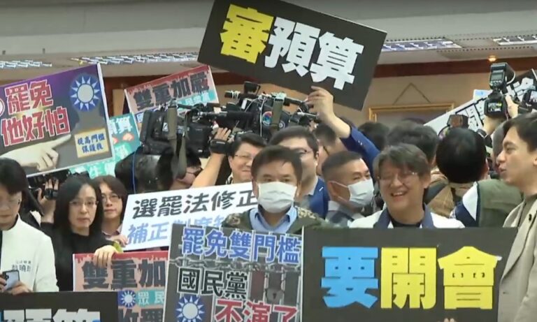 政經 內政委員會 選罷法 鬧事 立院審選罷法 朝野意見不合爆衝突亂一團 27 立法院內政委員會開議時間還沒到,民進黨團就已占領主席臺,國民黨的召委徐欣瑩被層層包圍,無法衝破防線只能待在原地發話。 2024-11-20 19:03