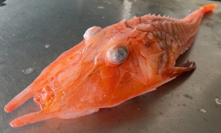 生活 台東大武 深海魚 龍王魚 台東捕獲「龍頭蝦身」怪魚 民眾搶圍觀拍照 72 白色的眼睛,頭上還有兩隻小觸角,整個魚身呈現橘紅色,這隻「龍頭蝦身」長相奇怪的魚,學名叫做「鋸棘紅魴鮄魚」。 2023-06-26 19:31
