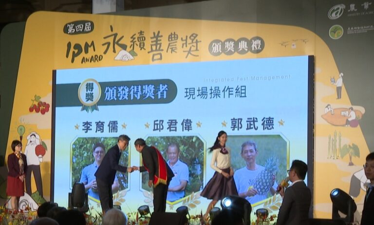 第四屆永續善農獎在台北中山堂盛大舉行,農業部強調,面對氣候變遷帶來的極端天候衝擊,台灣農業必須持續精進與轉型,因此推出「永續善農獎」,透過導入IPM病蟲害整合管理,鼓勵農民在兼顧生產的同時,實踐友善耕作。