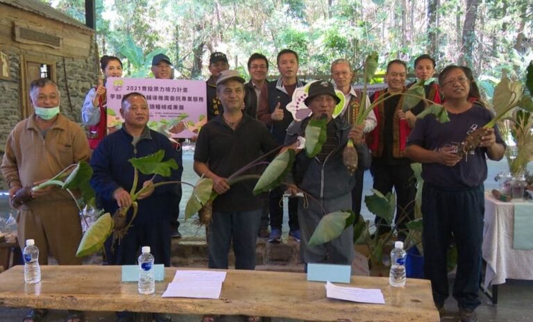 手拿自己種出來的芋頭,分享種植經驗,信義鄉濁水溪沿線,常遭受焚風等天候因素,較難發展出高經濟的農作物,為了創造適地性農業,南投縣原民局輔導濁水溪線部落以高山旱芋的培育方式種植芋頭,並透過農改場的專業指導,期盼對當地帶來新興的農特產...。
