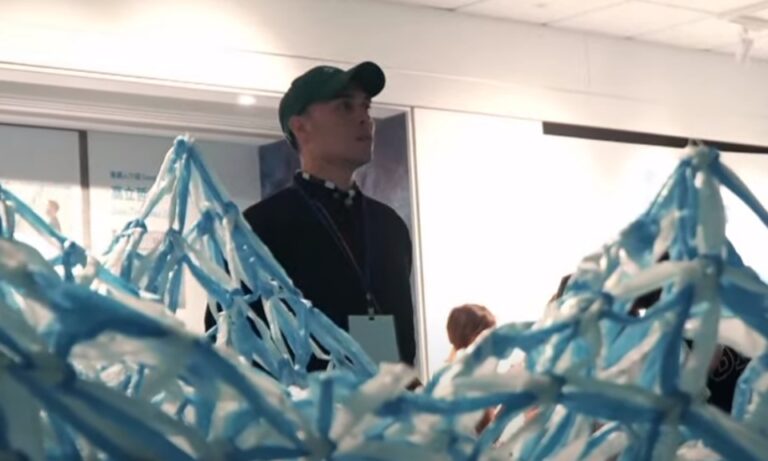 藍白相間的帆布,在部落裡頭的婚喪喜慶,都能看到它的身影,泰雅族藝術家Yukan Yulaw,透過藍白帆布將展場包覆起來,讓來訪的觀眾也能進入Yukan記憶中,部落生活勞動的樣貌。