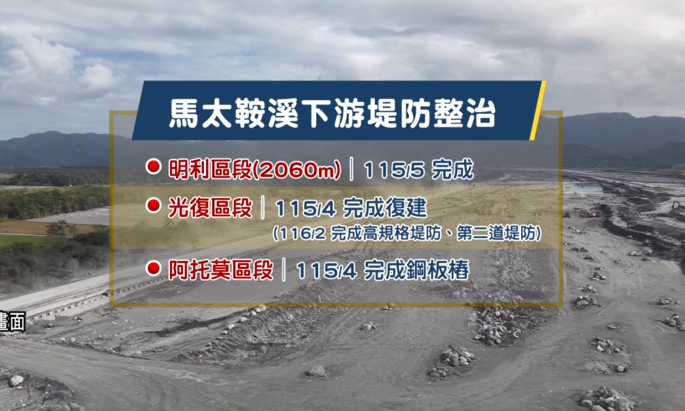 馬太鞍溪洪災復原進行式,經濟部指出,目前馬太鞍溪整治工程,明利區段今年五月可完成保護工程加固,光復區段今年四月能完成堤防復建,至於直衝的Atomo區段,四月前優先完成鋼板樁,以達防洪標準 。 經濟部次長 賴建信:「為什麼要打鋼板樁,就是我們預想說,若是極端的事件再發生的話,它對於基礎的保護,要有一定